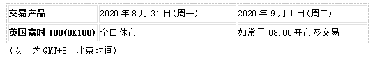 因应2020年8月31日为英国市场夏季银行假期,英国富时100指数UK100将于2020年8月31日(周一)全日休市,敬请知悉留意!