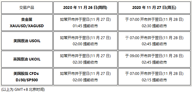 因应2020年11月26日(周四)及11月27日(周五)为美国感恩节假期,以下产品的交易时间将于假期提早休市,敬请阁下留意知悉!
