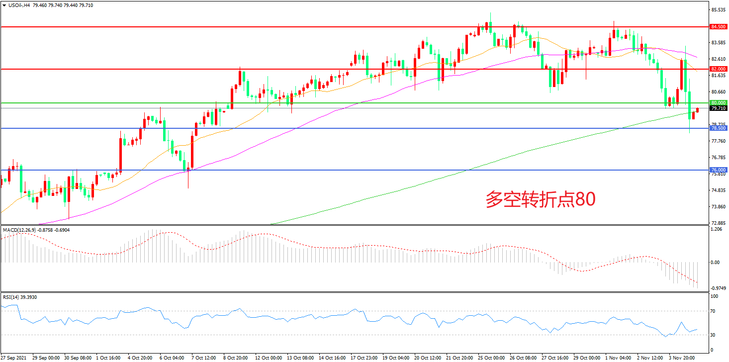 4小时图看,油价高位震荡后连续下破,整体表现低迷,82成为短期阻力,80美元成为多空分水岭,MACD绿柱增加,RSI指标走平,日内震荡下行概率较大。