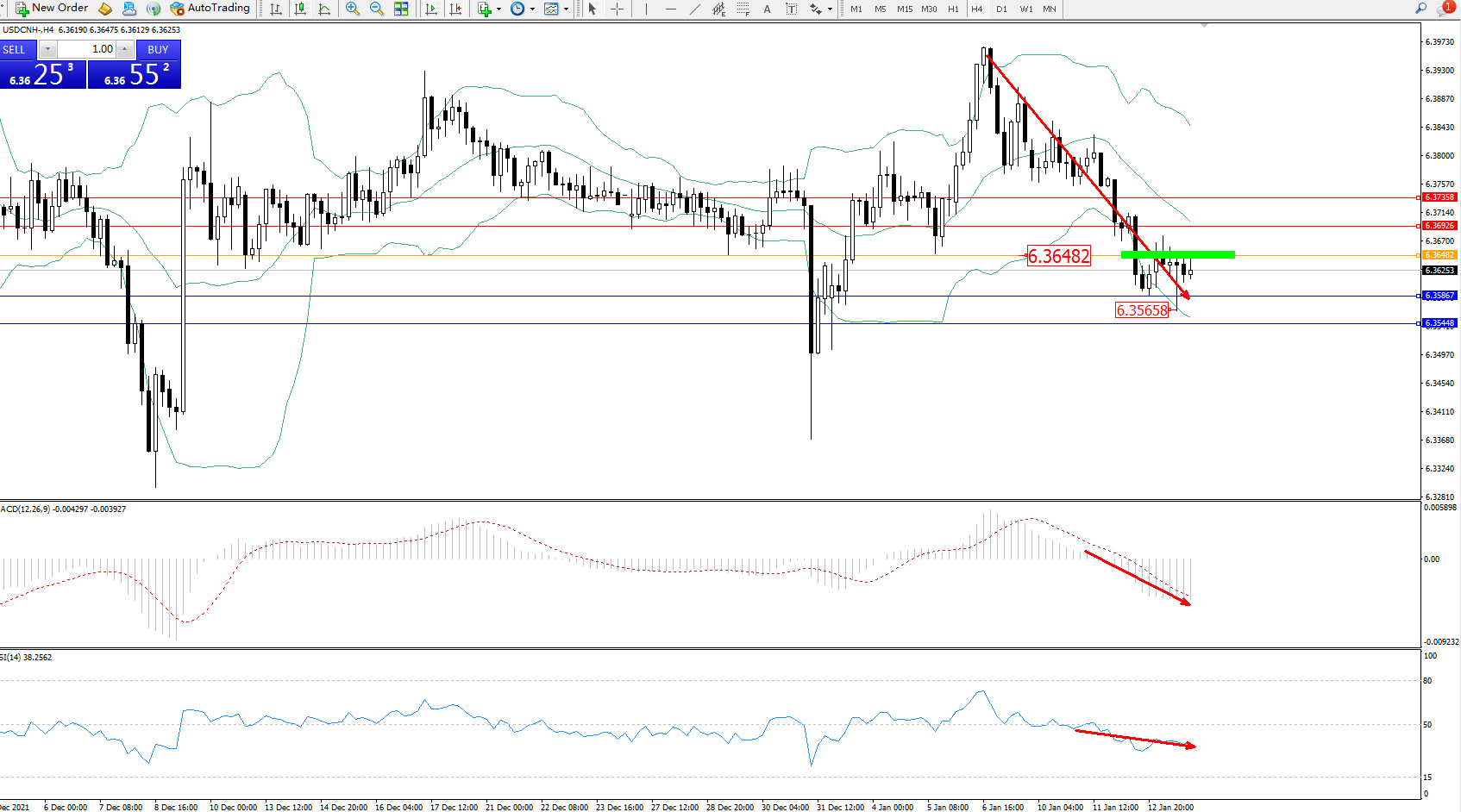 美元人民币USDCNH——4小时K线图显示: