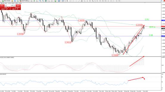 低位多头动力延续布林带指标通道中上轨区间持续震荡上扬,高位抵达1.37479附近节点后遇阻回撤,该位正式上方下行趋势线关键压制节点附近,布林带指标呈收口走势持续拉升上扬中,短期多头动力尚未有最终止步迹象,MACD指标处于多头区域维持震荡上移,RSI指标处于多头区域维持震荡上移至超买区80均衡线下侧后遇阻开始整理向下移动,如图: