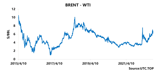 美国炼油厂的盈利预期将遭受直接的冲击,RBOB-WTI和HO-WTI裂解基差、美湾成品油轮运费价格,将在短期内被基金大举抛售,因为在精炼产品禁令之下,美湾炼厂加工量计划必然调减,而美国原油可供出口的数量则在短期内面临激增的局面,WTI价格将遭到冲击,而后更多国家会涌向美国购买WTI为基准计价的原油,将导致布伦特-WTI价差会缩窄。