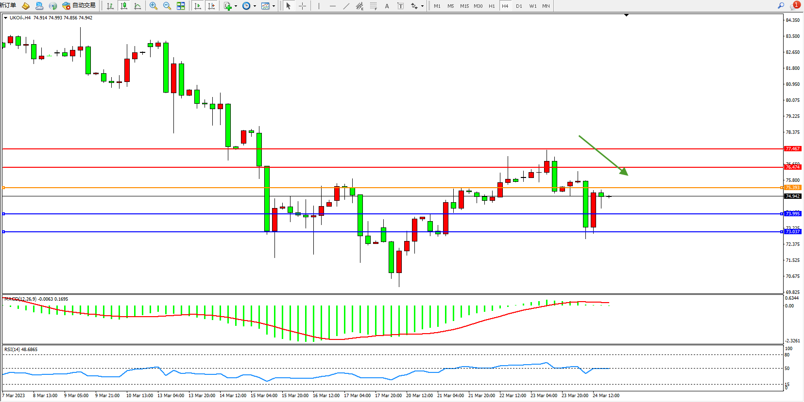 布油维持74.942附近震荡,美国能源部长暗示该国并不急于补充战略石油储备(SPR),在全球银行业持续动荡之际,投资者担心市场可能出现供应过剩。