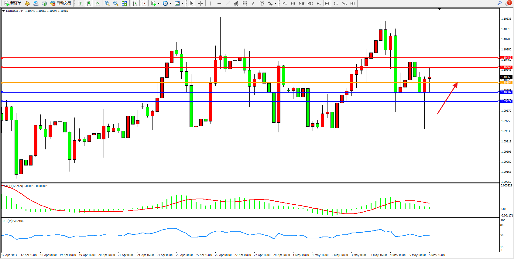 欧元美元EURUSD—4小时K线图显示: