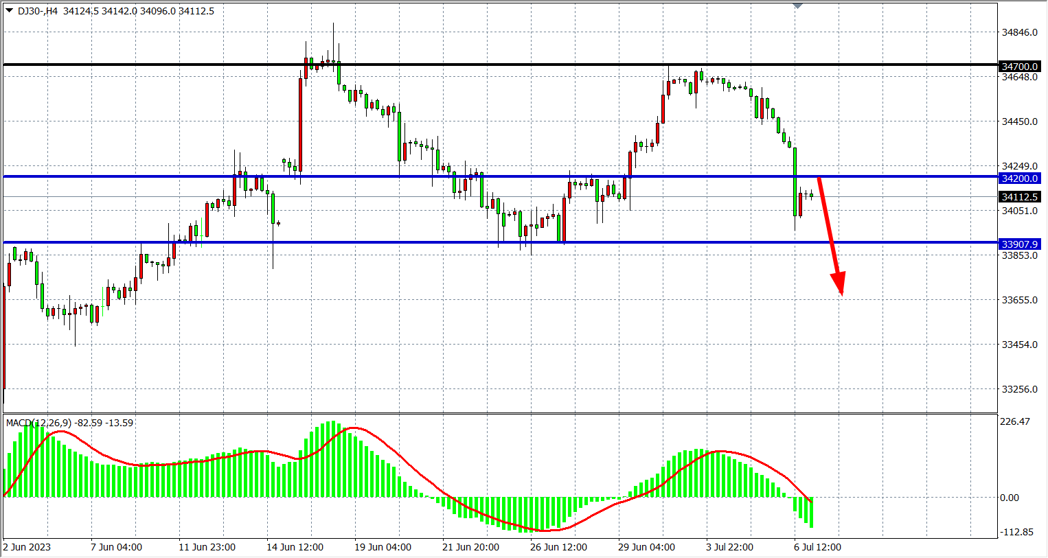 4小时图看,道指进一步下跌破34200,MACD量能在零轴下放量,下方支撑33900-33600,上方阻力34200-34500。