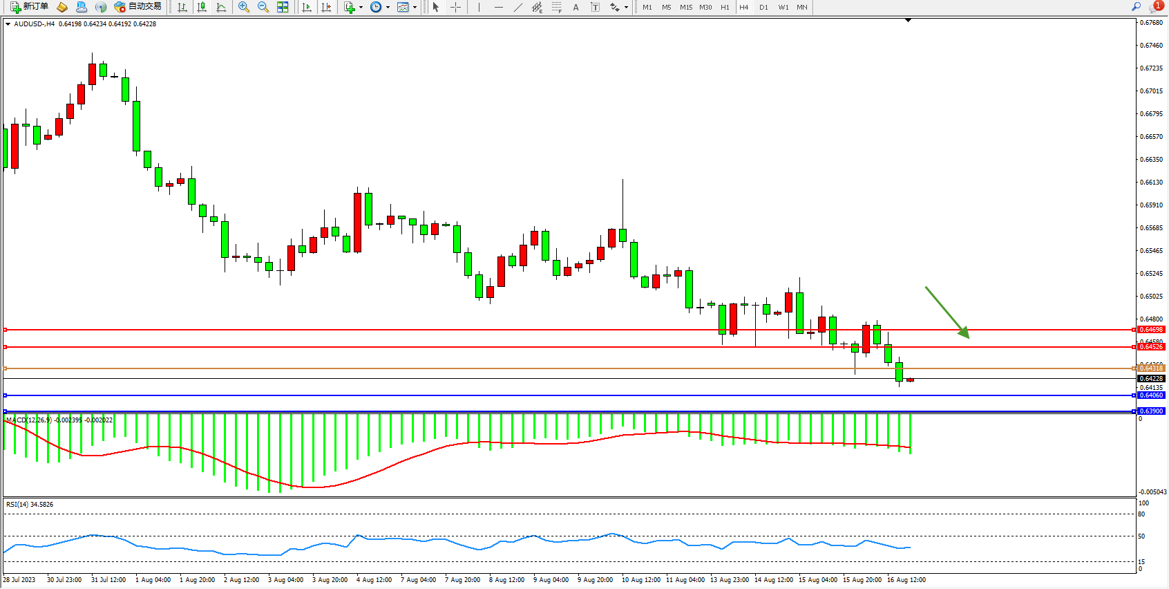 交易策略:0.64318下方看跌,目标0.64060 0.63900