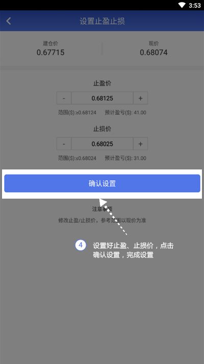 4.设置好止盈、止损价,点击[确认设置],完成设置