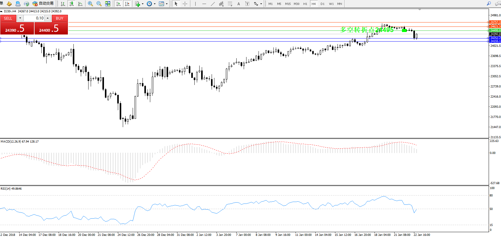 道琼斯指数DJ30—— 4小时K线图显示: