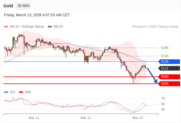 在 5135 之下,看跌,目标价位为 5080 ,然后为 5055 。